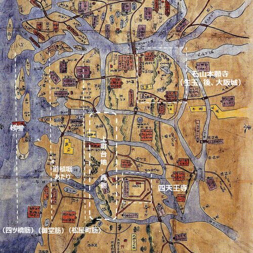 石山合戦配陣図(和歌山市立博物館蔵。石山合戦(1570-1580)当時の石山本願寺と織田信長軍の配置図)に現在の大阪を少し書き込んでみた。 石山合戦配陣図 秀吉公の前、今の大阪城の地には、石山本願寺という浄土真宗(門徒さん)の大きな寺と寺内町(じない…