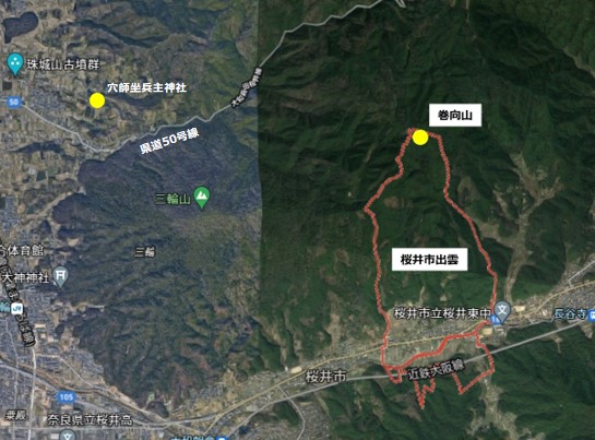 穴師山を調べるうちに、①穴師山から巻向山を経由して桜井市出雲に繋がっていること、②三輪山は巻向山などと山系を形づくる連山であること、に気づき、