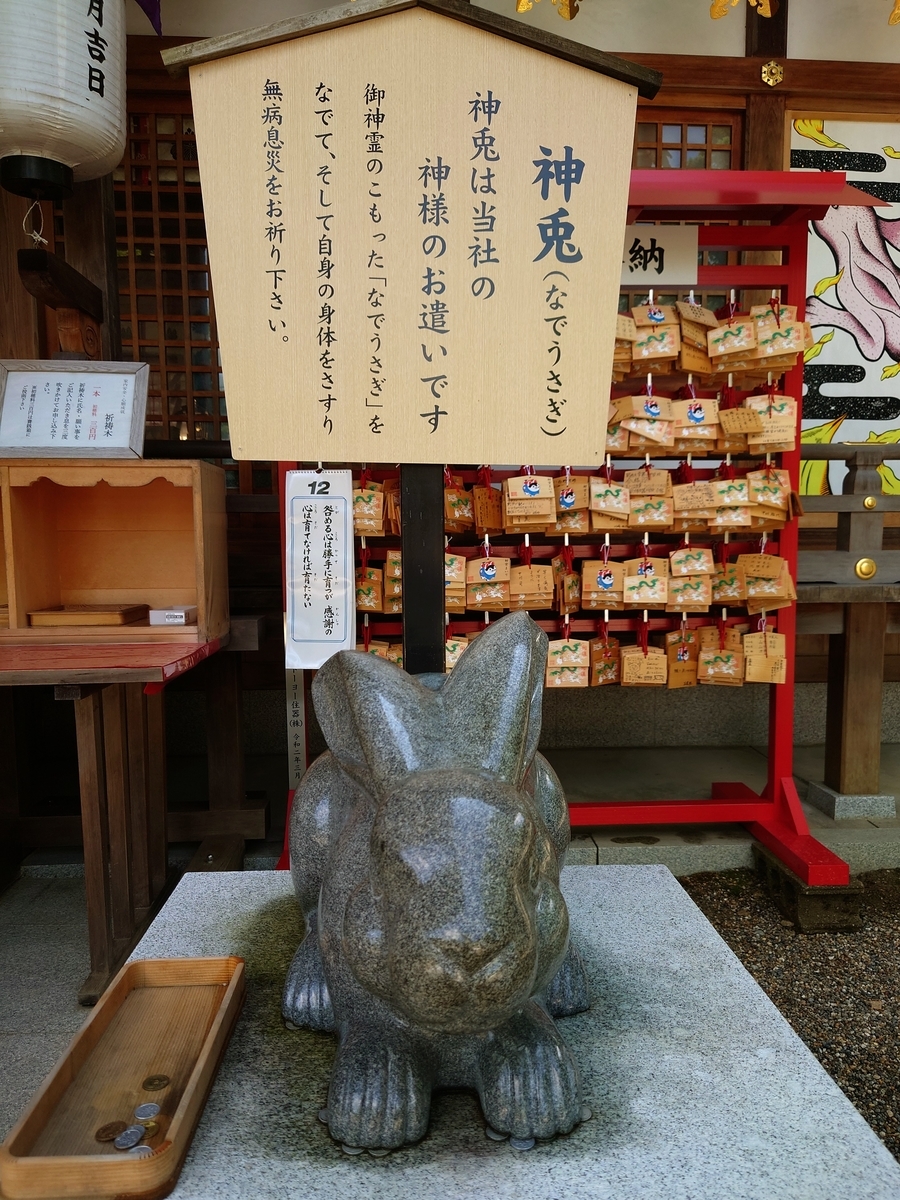 同社略紀より。文字起こし)神功皇后が三韓出兵の際、当社の神が住吉大社の神とともに海路・陸路を安全に道案内し、以来、江戸時代末期まで、当社と住吉大社とで夏祭りを行っていた。卯(兎)は当社の神のお遣いとして先導したと云われており、神を安全にお導きすることから交通安全や旅行安全などの案内や人々との良縁を導く(縁結び)ご利益がある。本殿第二殿の御祭神は伊勢神宮外宮の豊受姫大神を祀り、その神のお遣いが龍 とされている。また当社は下水分社(しもみくまりしゃ)と云われており、辰(龍)はその水を司る神であり、当社の神の遣いとも云われている。龍は天高く上り万物を守護するものであるとされ、昇運や金運招福など生活に恵みをもたらすご利益がある