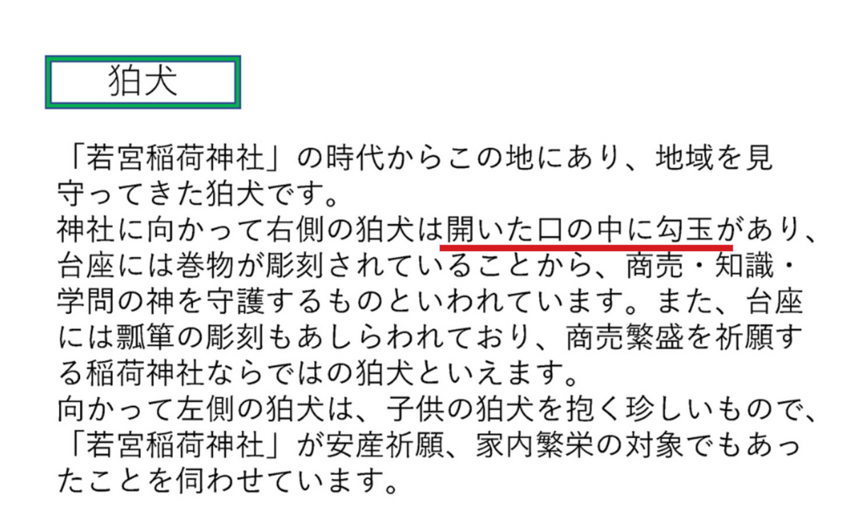 したがって、若宮商工稲荷神社の狛犬さんは、右側の勾玉を口に含んでいるほうがメスになります。